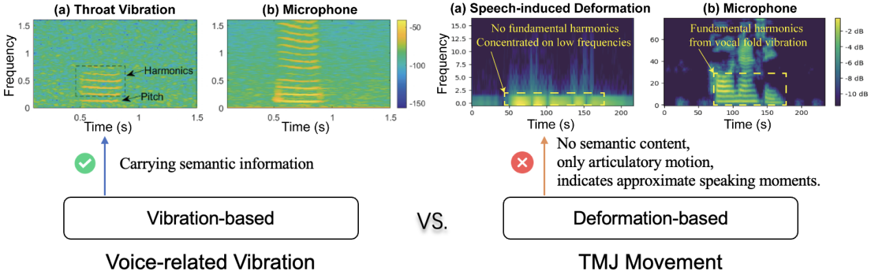 3.非声学模态与缺乏细粒度监督。如图4所示,与基于声带或扬声器振动的语音信号不同,TPVS源于人类内部发音动作,不含声能。其频谱图在语音领域并非固有有意义,使得直接映射到音频频谱图变得不可行。此外,无声语音缺乏对齐的音素或帧级标签,阻碍了传统监督回归或基于对齐模型的使用。
